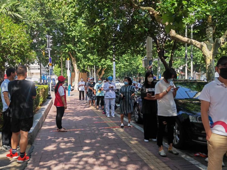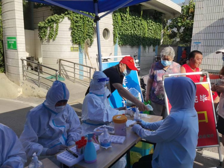 “請(qǐng)各位居民間隔一米五的距離,提前出示安康碼,綠碼可在此檢測點(diǎn)進(jìn)行檢測,黃碼人員一律前往市人民醫(yī)院進(jìn)行檢測,測體溫、準(zhǔn)備好自己的‘安康碼’或身份證……”6月28日,市建投交投公司機(jī)關(guān)黨支部黨員來到西街道鷹山社區(qū)的全員核酸檢測采樣點(diǎn)協(xié)助工作。
