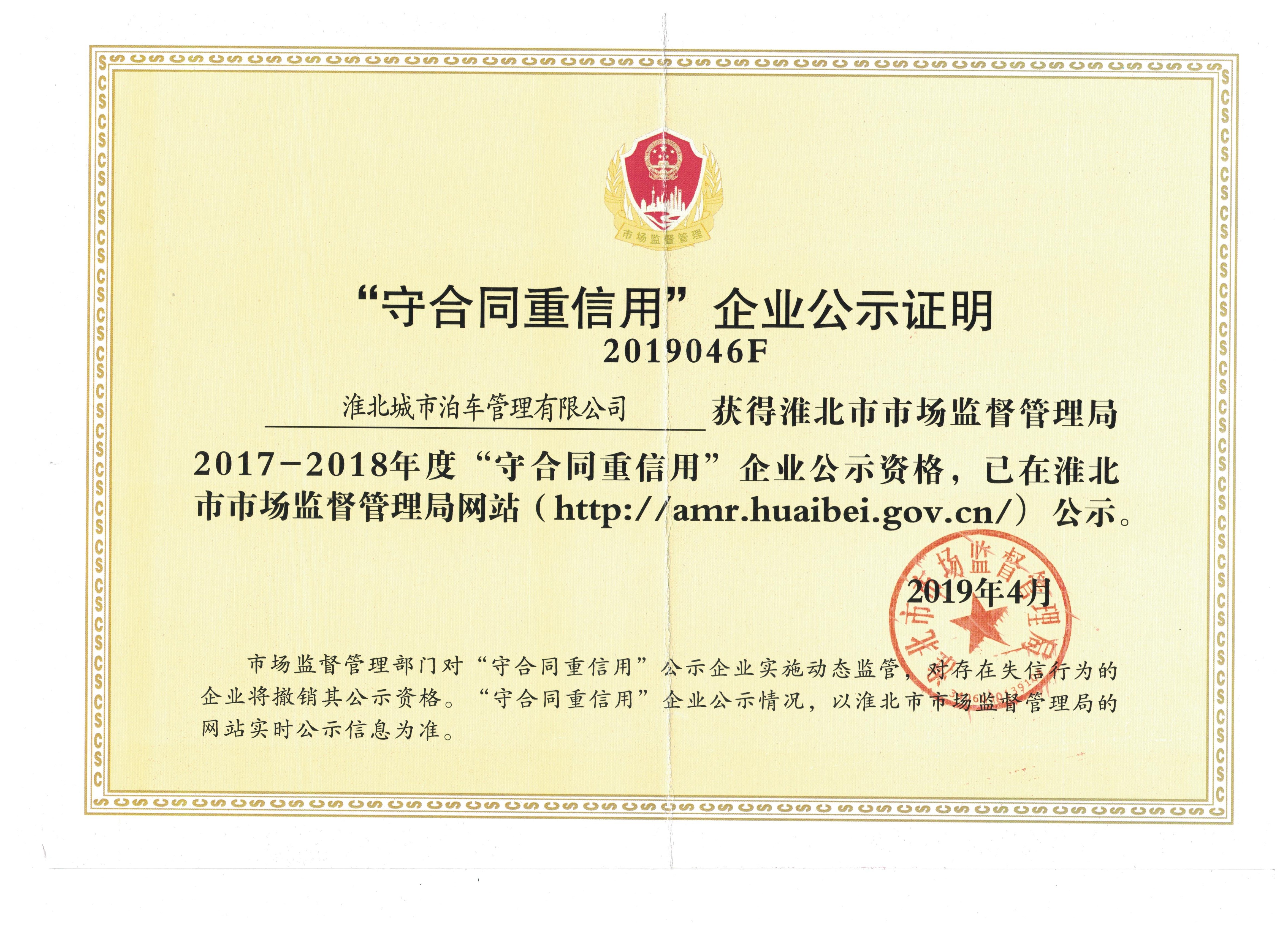 “人無信不立,事無信不成”,淮北城市泊車管理有限公司被評(píng)為2017-2018年度“守合同重信用”企業(yè),該信息已在淮北市市場(chǎng)監(jiān)督管理局官網(wǎng)公示。多年來,城泊公司堅(jiān)持以誠信作為企業(yè)長(zhǎng)遠(yuǎn)發(fā)展的基石,以“誠信經(jīng)營(yíng)”作為公司發(fā)展宗旨,高度重視合同的規(guī)范管理,講誠信、重履約,真正做到對(duì)國家、社會(huì)、消費(fèi)者負(fù)責(zé),得到了社會(huì)各界的廣泛贊譽(yù)和認(rèn)可。